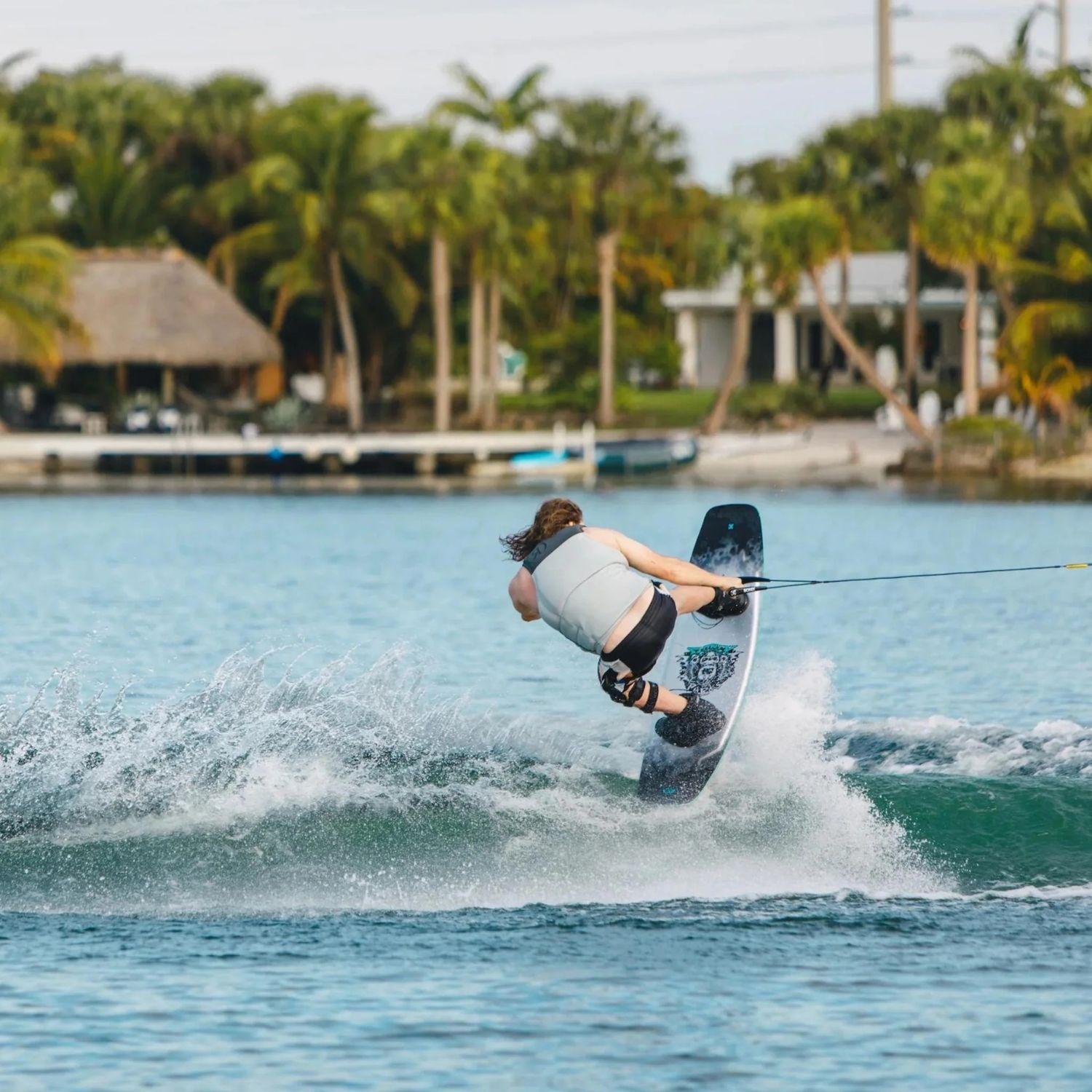 The Ronix Parks is the high-speed carving machine of the lineup, engineered for riders who want to move fast without fighting the boat. By blending a Continuous Rocker with snowboard-inspired Arced Tips, Ronix created a shape that slices through lake chop and "white wash" like a hot knife through butter. This extra glide speed is the secret weapon for anyone currently casing the wake—it converts horizontal momentum into effortless distance, allowing you to clear both wakes with much less physical strain.
